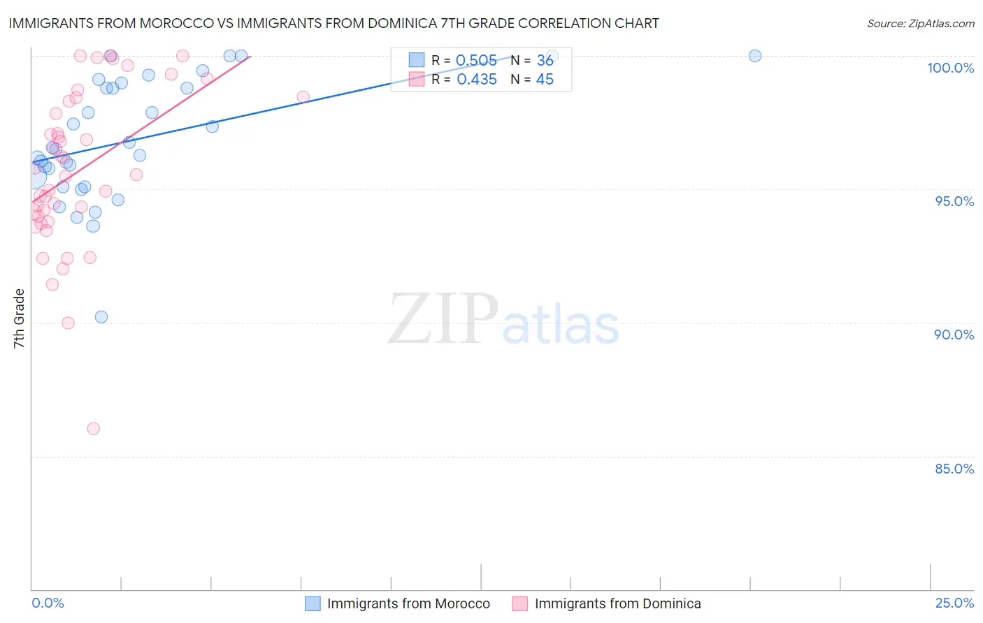 Immigrants from Morocco vs Immigrants from Dominica 7th Grade Correlation Chart