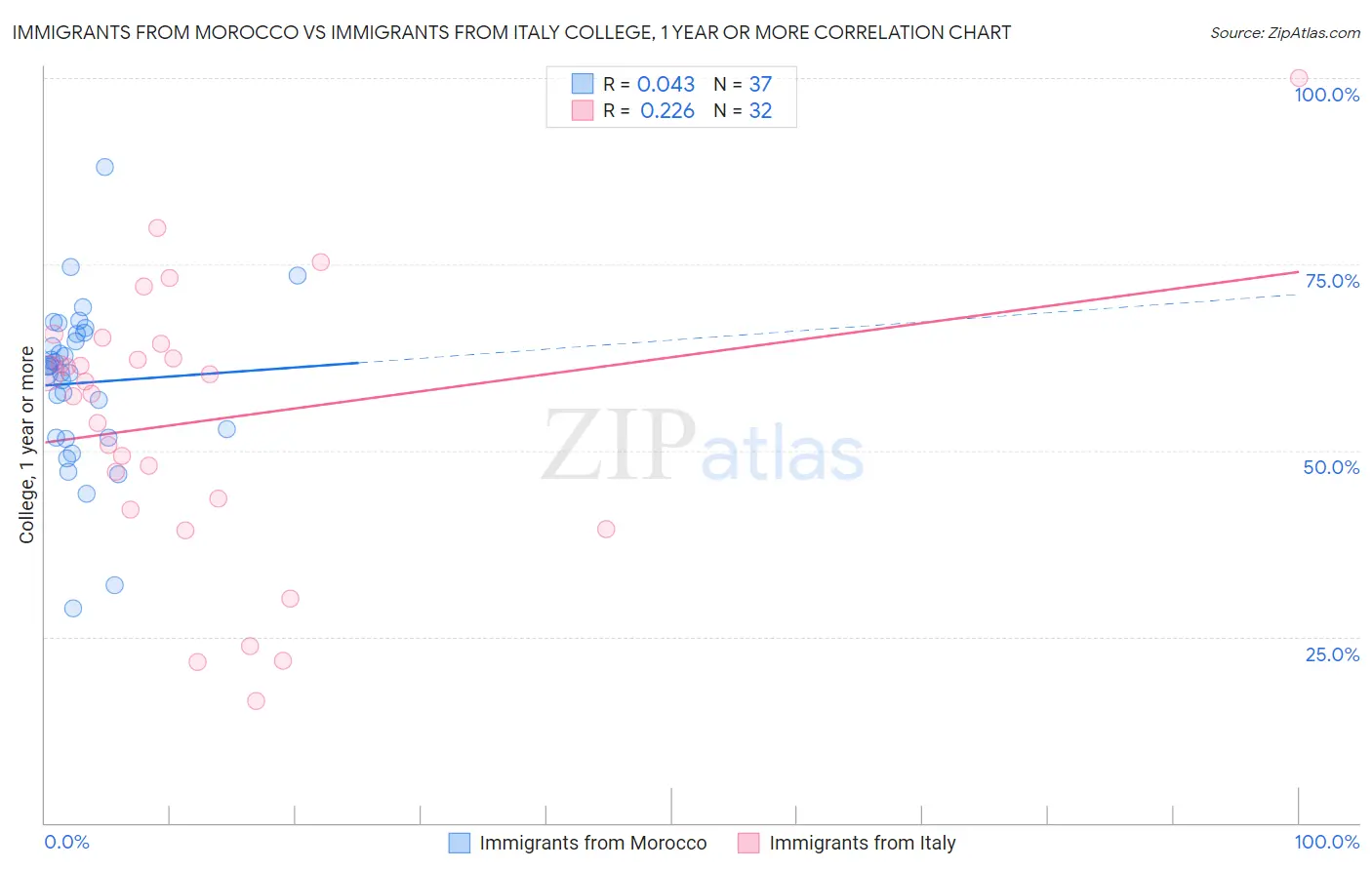 Immigrants from Morocco vs Immigrants from Italy College, 1 year or more Correlation Chart