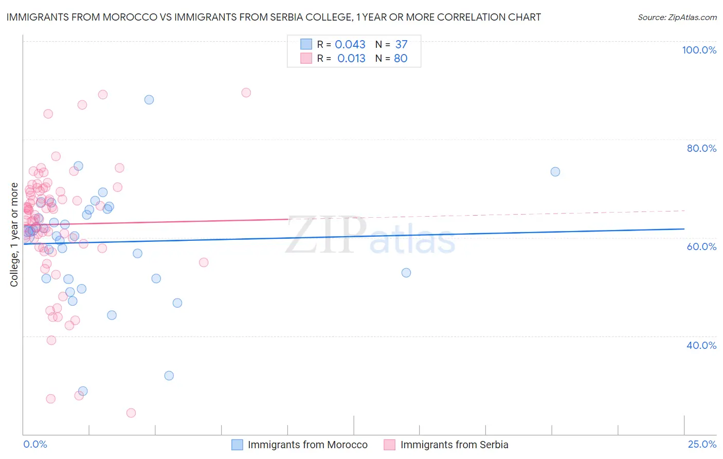 Immigrants from Morocco vs Immigrants from Serbia College, 1 year or more Correlation Chart