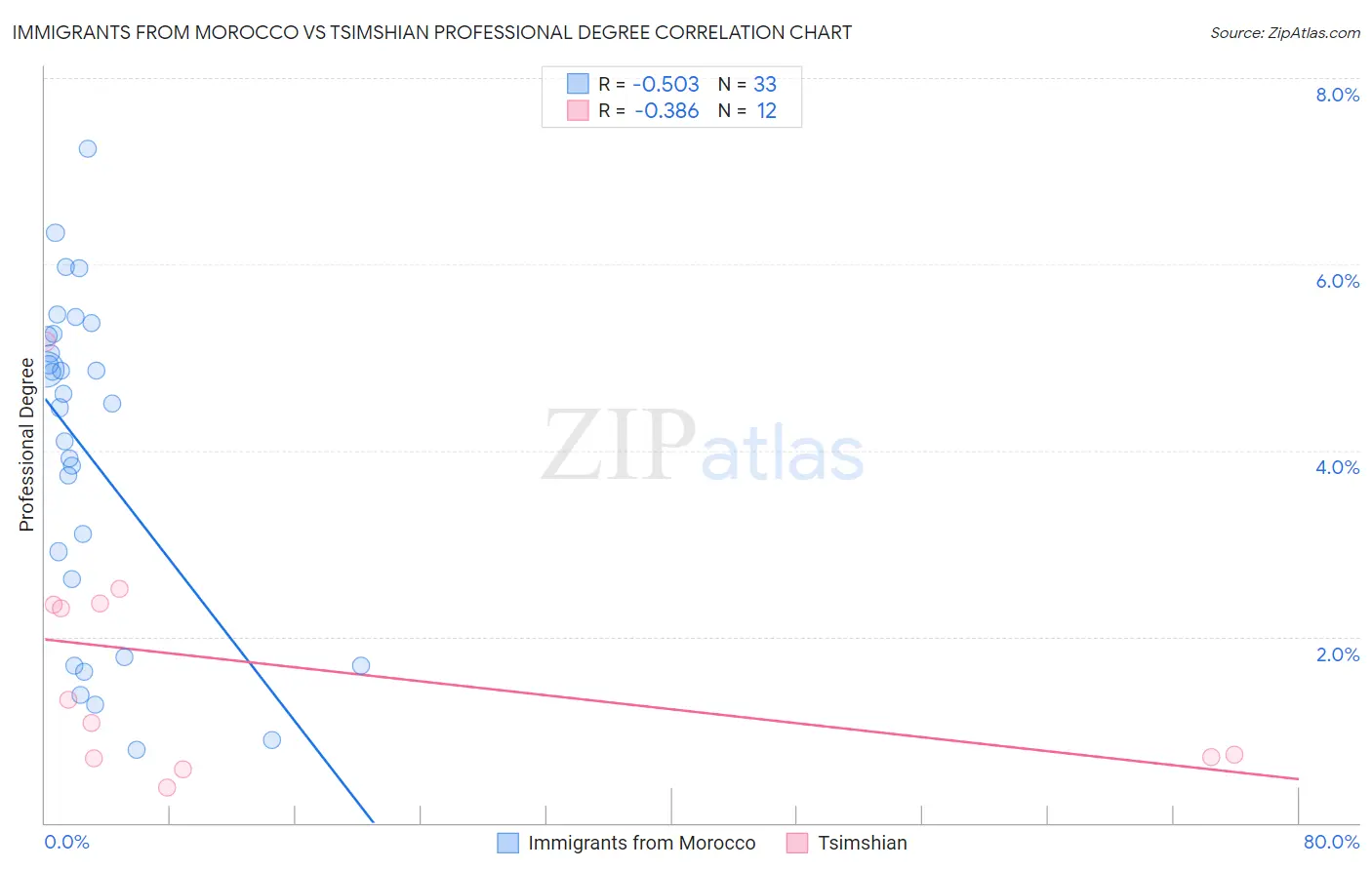 Immigrants from Morocco vs Tsimshian Professional Degree Correlation Chart