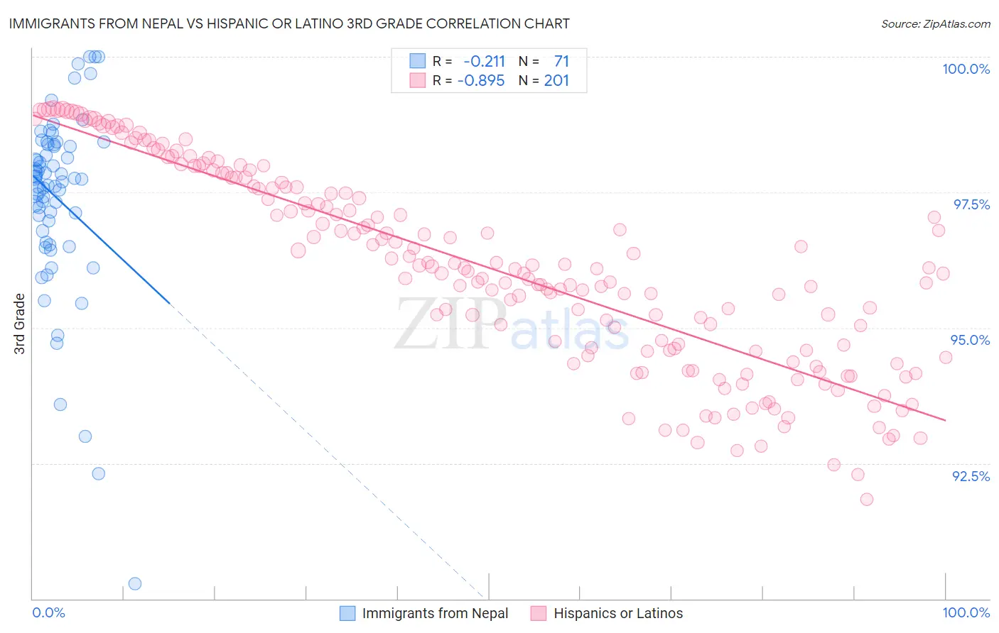 Immigrants from Nepal vs Hispanic or Latino 3rd Grade Correlation Chart