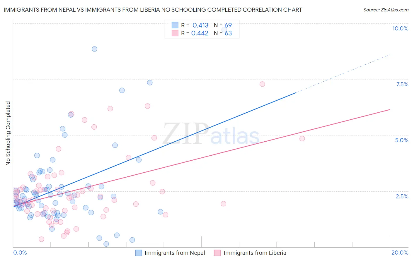 Immigrants from Nepal vs Immigrants from Liberia No Schooling Completed Correlation Chart