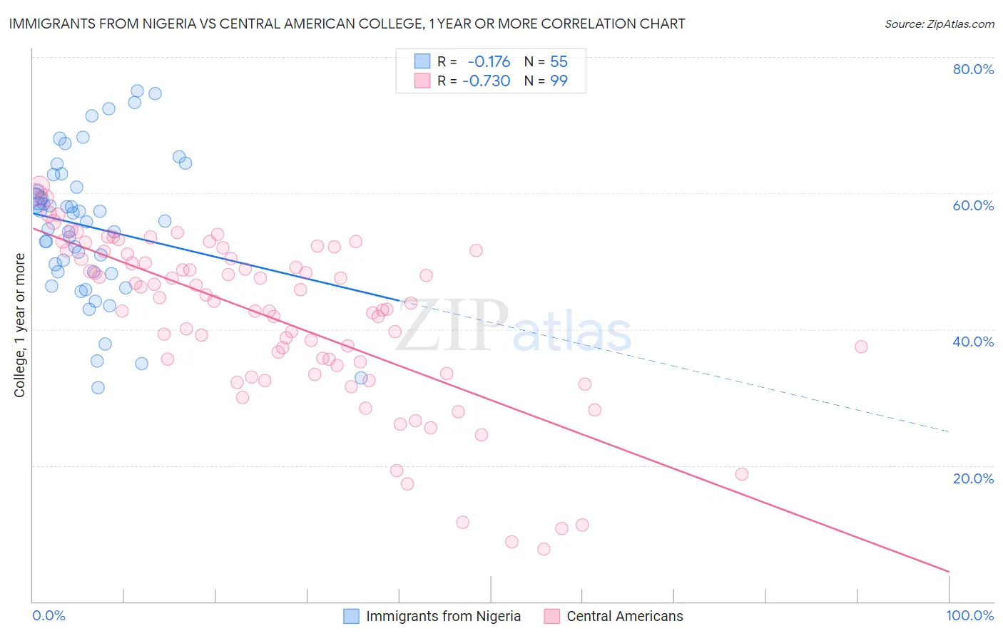 Immigrants from Nigeria vs Central American College, 1 year or more Correlation Chart