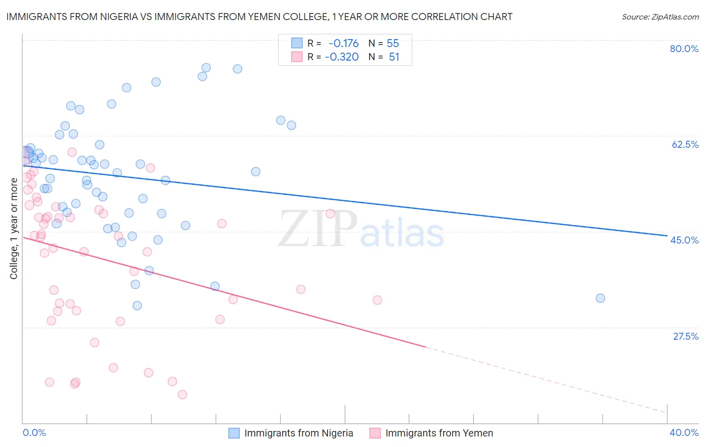 Immigrants from Nigeria vs Immigrants from Yemen College, 1 year or more Correlation Chart