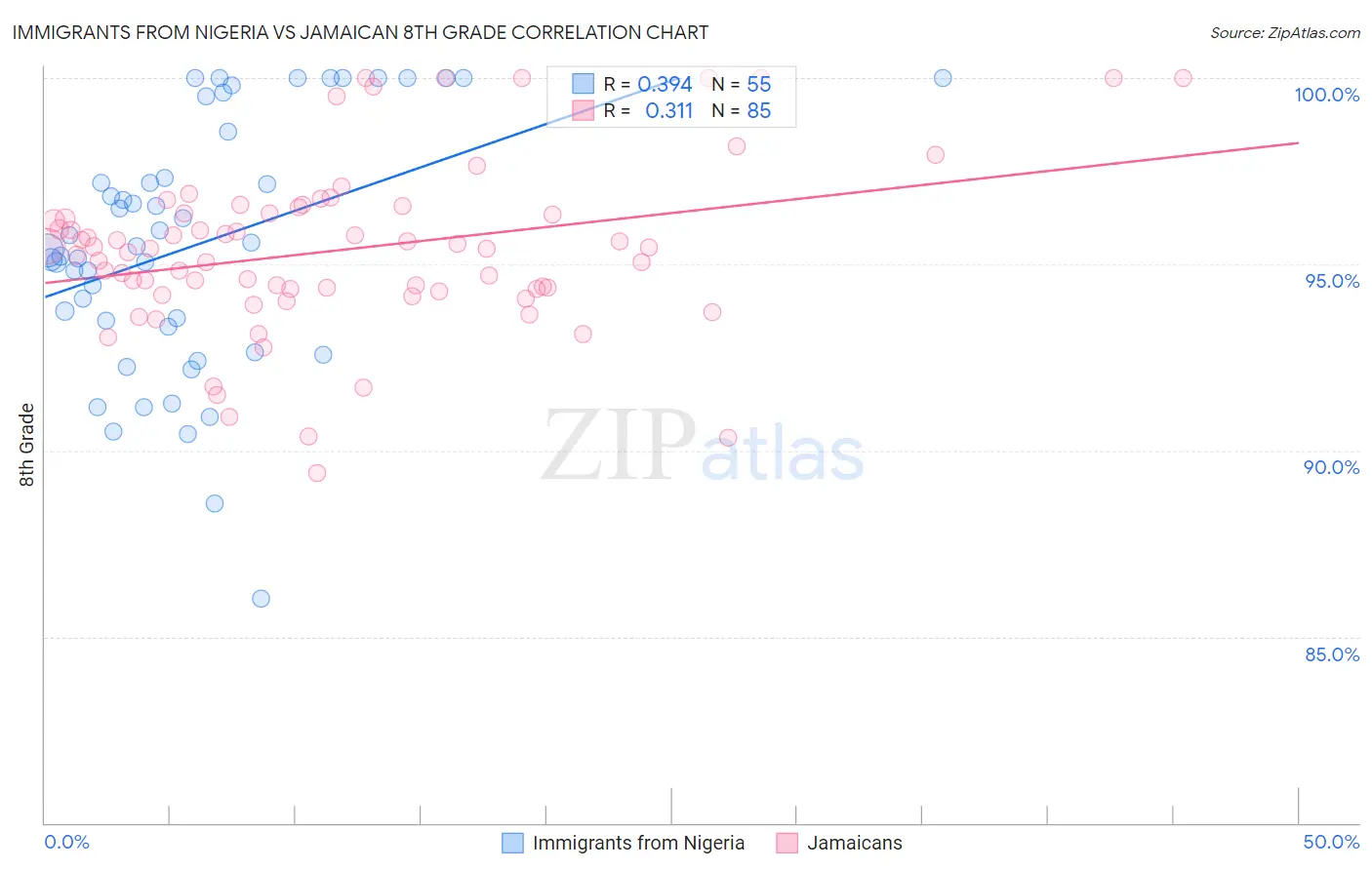 In terms of 8th grade, the demographic groups most similar to Immigrants from Nigeria are Immigrants from Hong Kong (94.9%, a difference of 0.010%), Immigrants from Costa Rica (94.9%, a difference of 0.020%), Immigrants from Jamaica (94.9%, a difference of 0.050%), Immigrants from Congo (94.9%, a difference of 0.060%), and Ghanaian (94.9%, a difference of 0.060%). Similarly, the demographic groups most similar to Jamaicans are Somali (95.1%, a difference of 0.010%), Immigrants from Senegal (95.1%, a difference of 0.010%), Uruguayan (95.1%, a difference of 0.020%), Paiute (95.1%, a difference of 0.030%), and Immigrants from Middle Africa (95.1%, a difference of 0.030%).