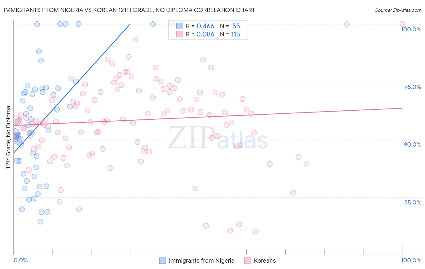 Immigrants from Nigeria vs Korean 12th Grade, No Diploma Correlation Chart