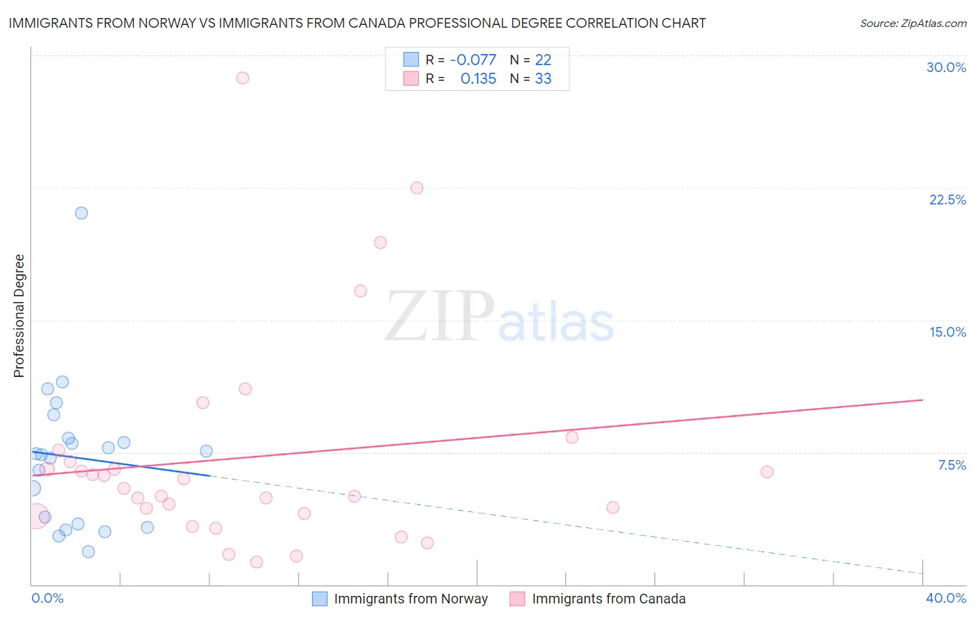 Immigrants from Norway vs Immigrants from Canada Professional Degree Correlation Chart