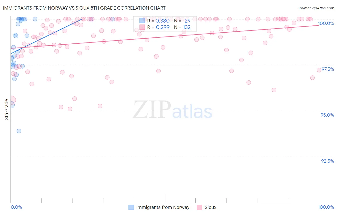 Immigrants from Norway vs Sioux 8th Grade Correlation Chart