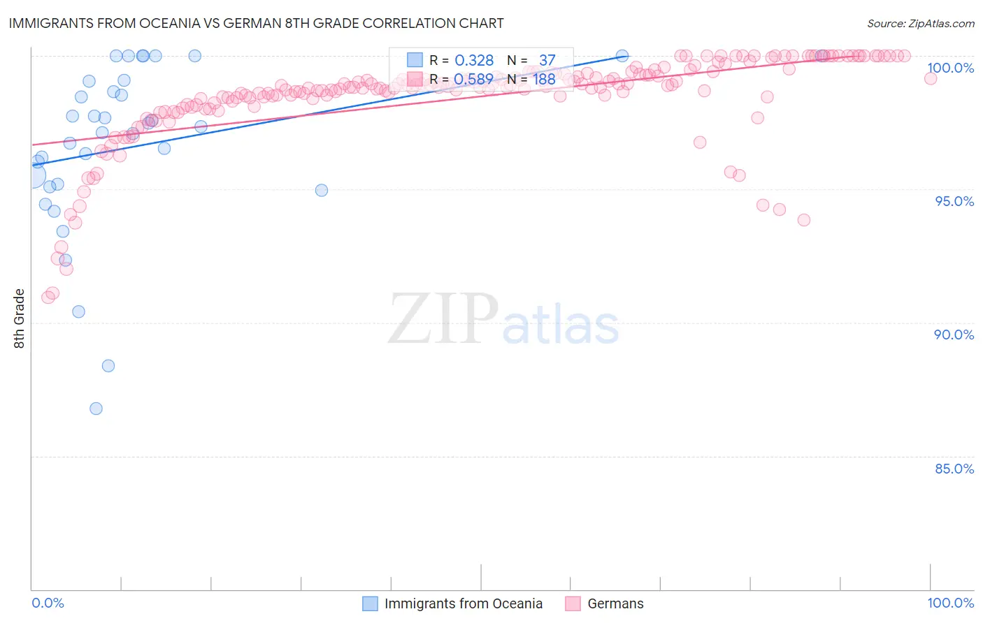 Immigrants from Oceania vs German 8th Grade Correlation Chart