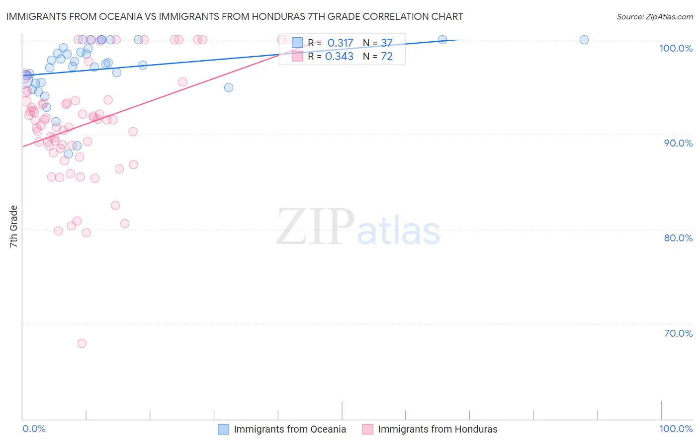 Immigrants from Oceania vs Immigrants from Honduras 7th Grade Correlation Chart
