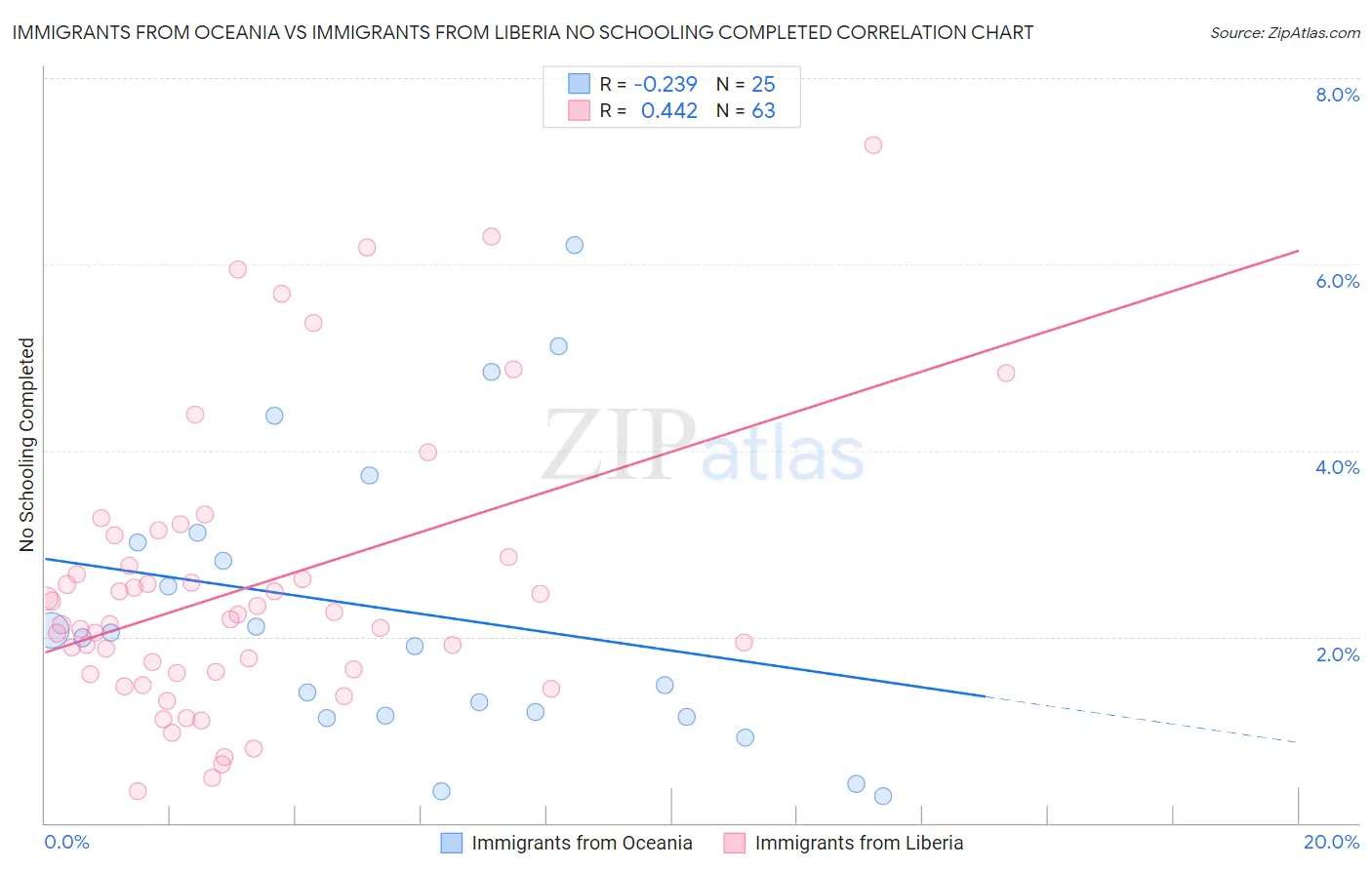 Immigrants from Oceania vs Immigrants from Liberia No Schooling Completed Correlation Chart