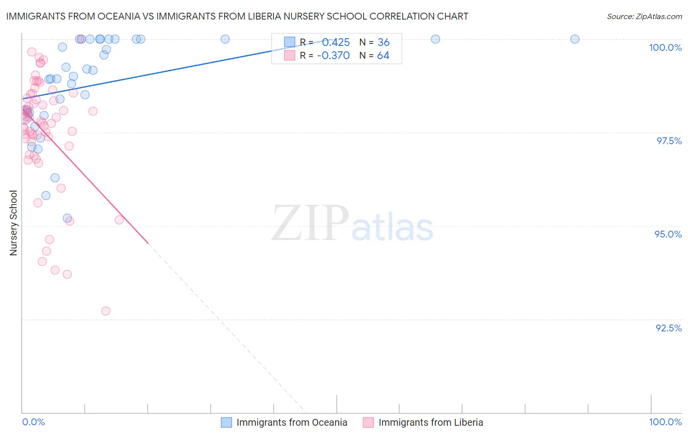 Immigrants from Oceania vs Immigrants from Liberia Nursery School Correlation Chart