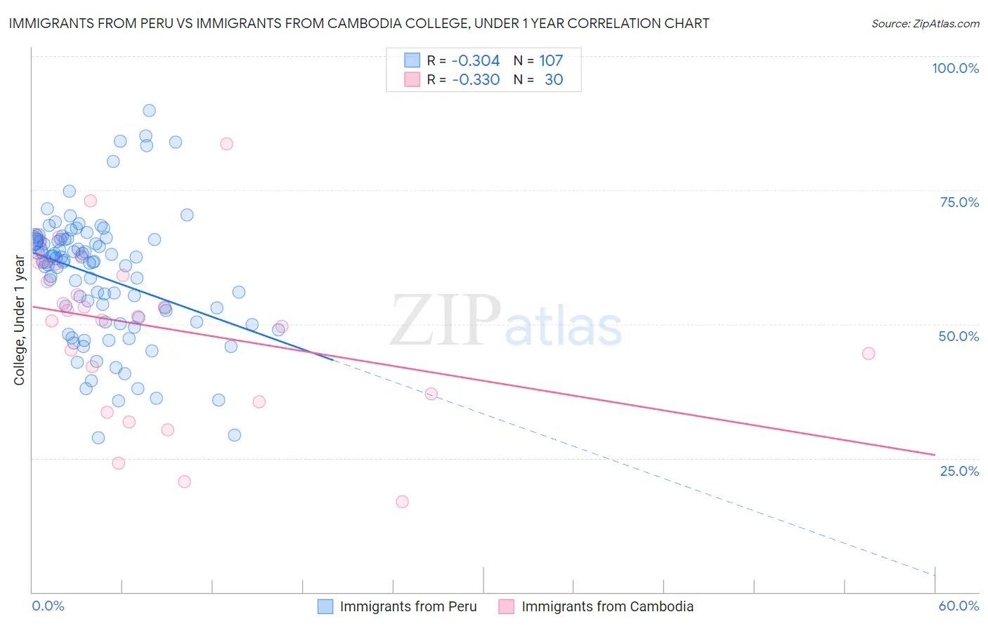 Immigrants from Peru vs Immigrants from Cambodia College, Under 1 year Correlation Chart