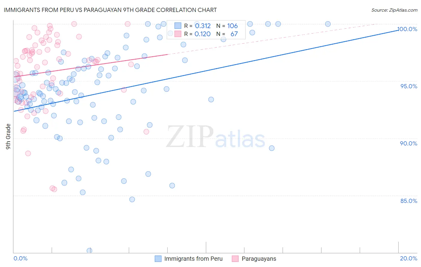 Immigrants from Peru vs Paraguayan 9th Grade Correlation Chart