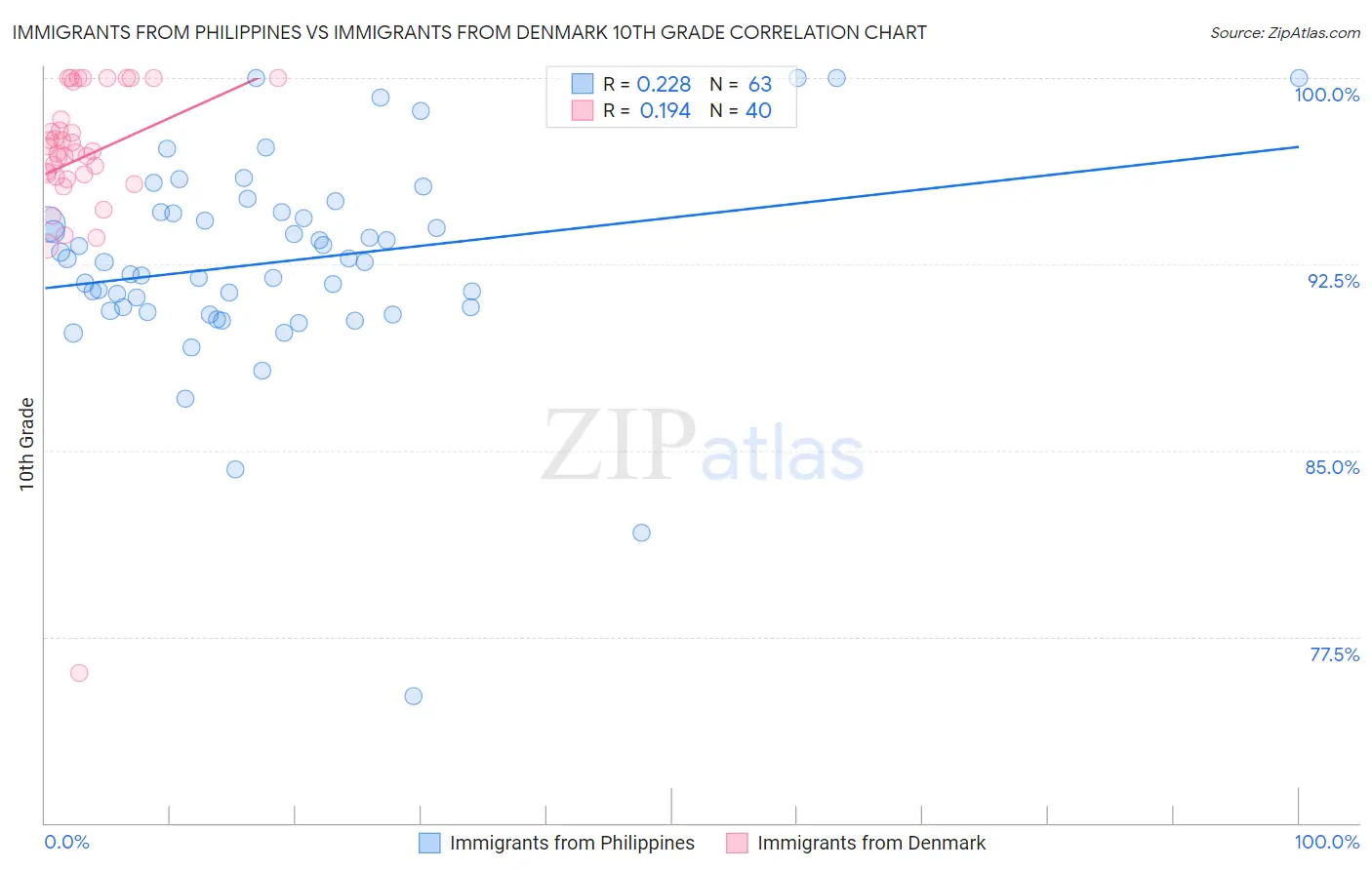 Immigrants from Philippines vs Immigrants from Denmark 10th Grade Correlation Chart