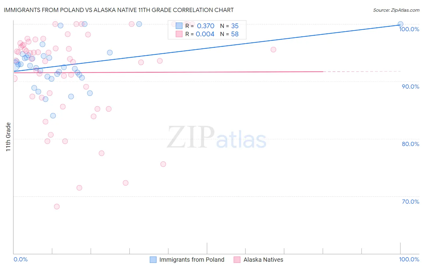 Immigrants from Poland vs Alaska Native 11th Grade Correlation Chart