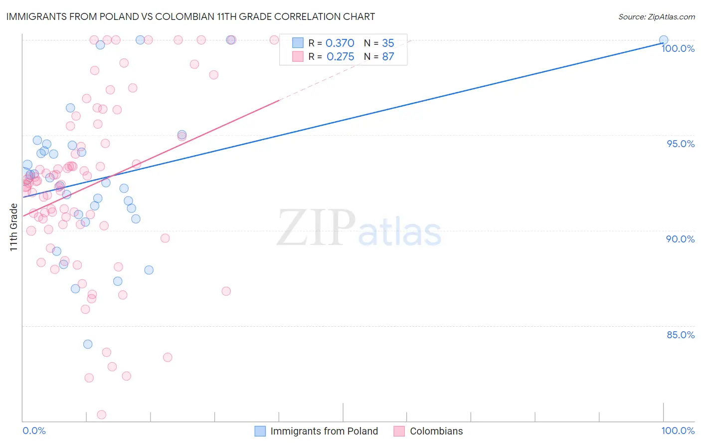 Immigrants from Poland vs Colombian 11th Grade Correlation Chart