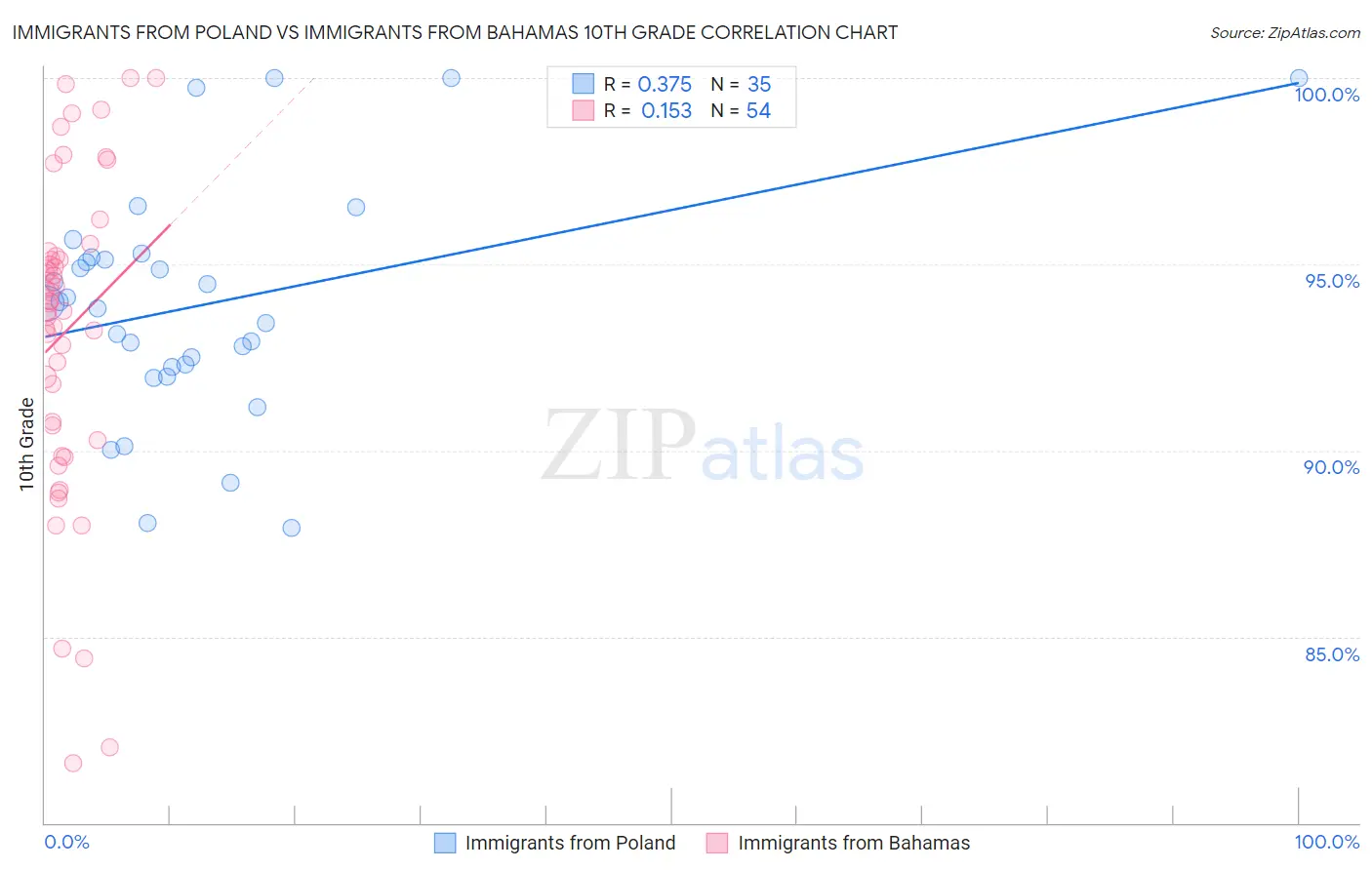Immigrants from Poland vs Immigrants from Bahamas 10th Grade Correlation Chart