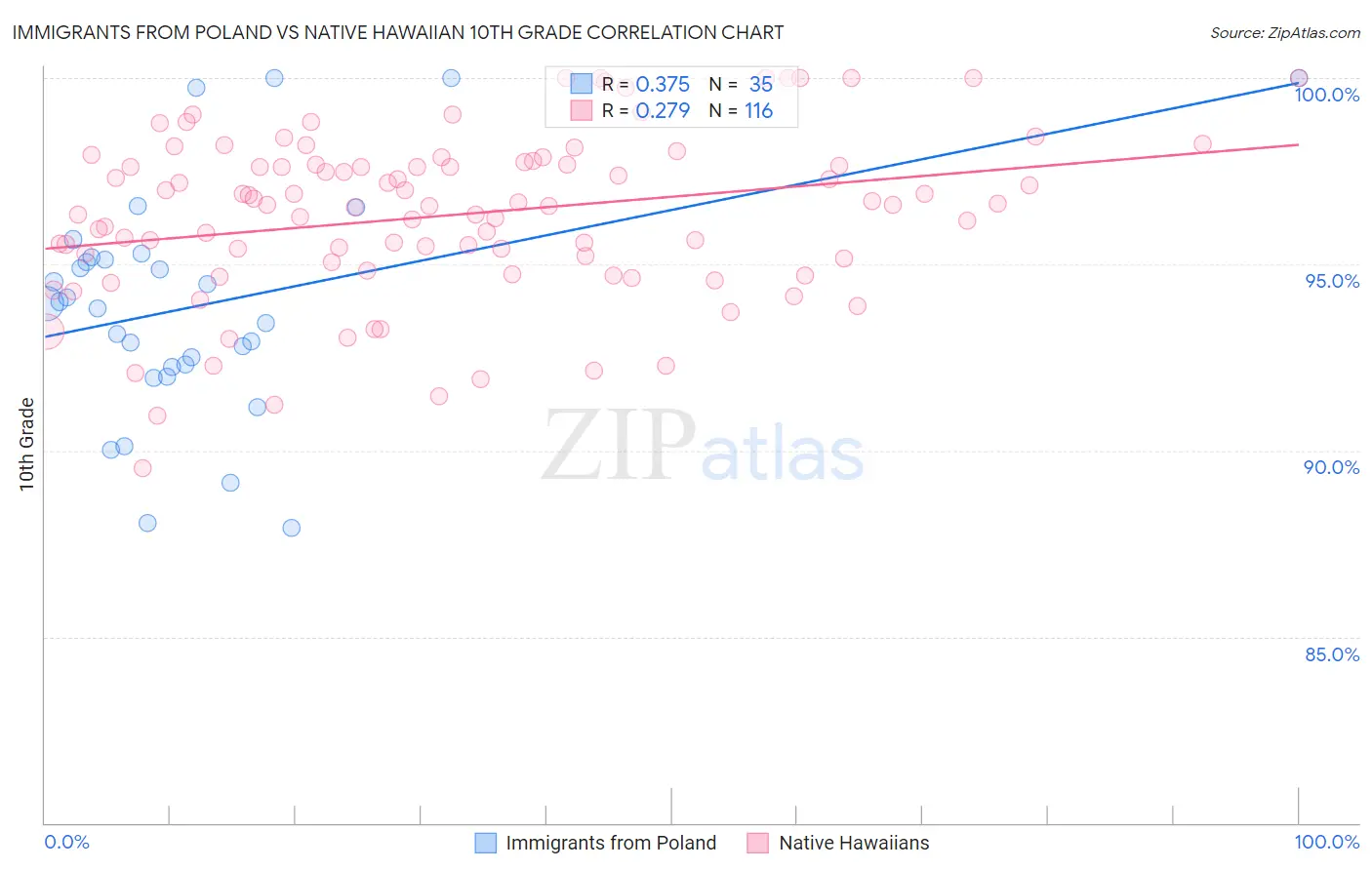 Immigrants from Poland vs Native Hawaiian 10th Grade Correlation Chart