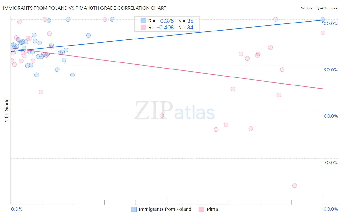Immigrants from Poland vs Pima 10th Grade Correlation Chart