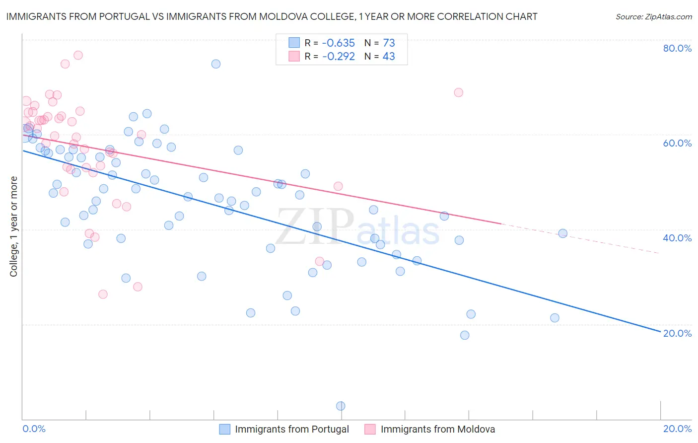 Immigrants from Portugal vs Immigrants from Moldova College, 1 year or more Correlation Chart