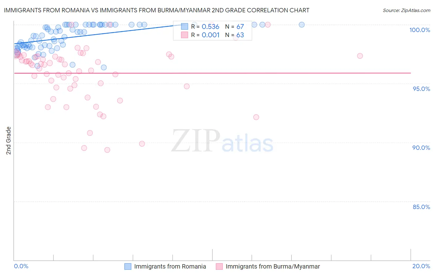 Immigrants from Romania vs Immigrants from Burma/Myanmar 2nd Grade Correlation Chart