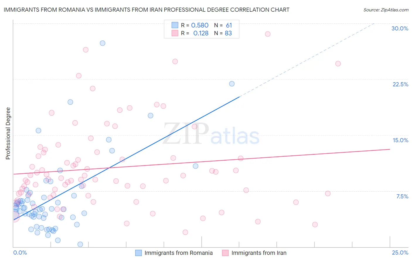 Immigrants from Romania vs Immigrants from Iran Professional Degree Correlation Chart