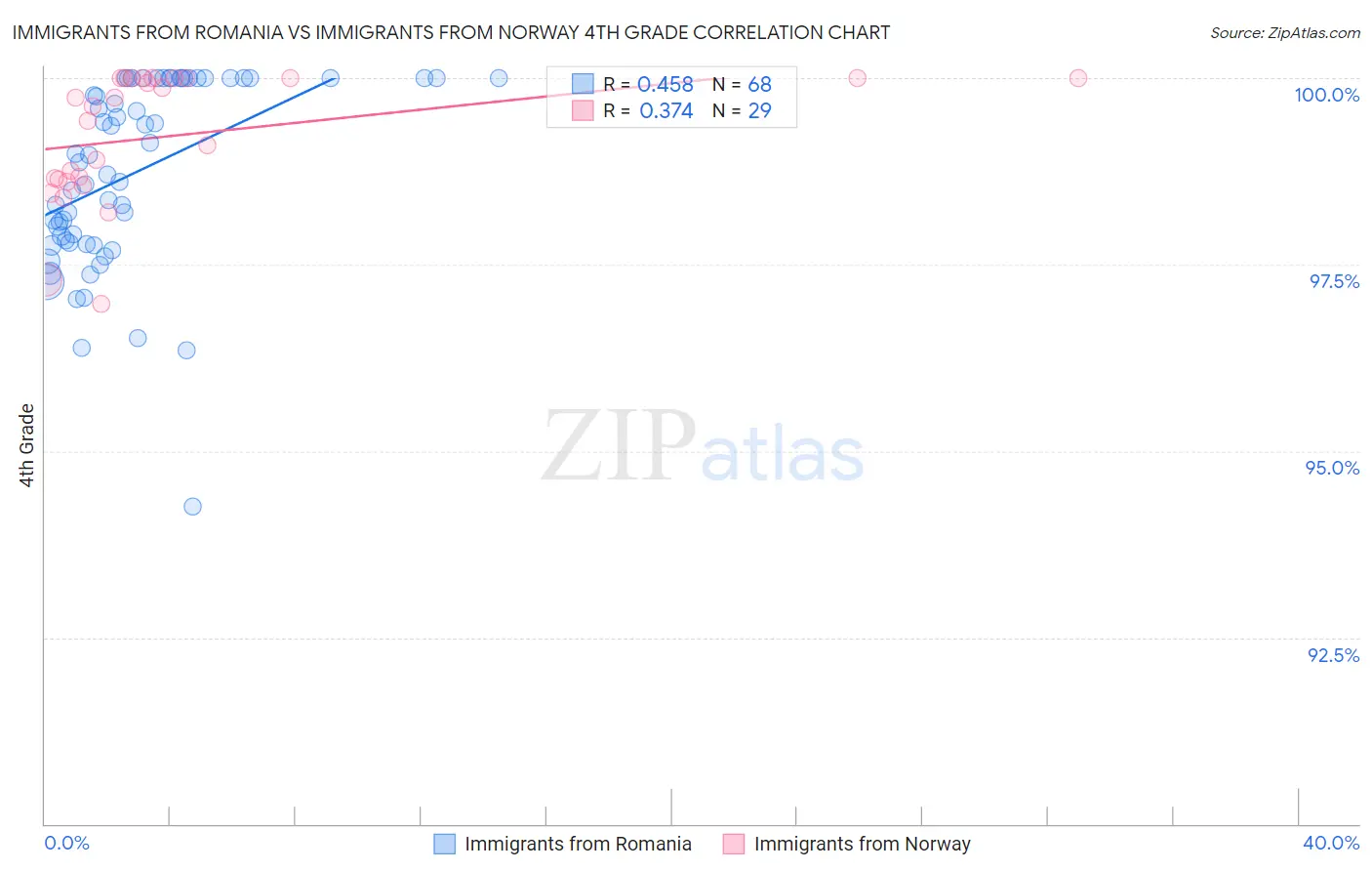 Immigrants from Romania vs Immigrants from Norway 4th Grade Correlation Chart