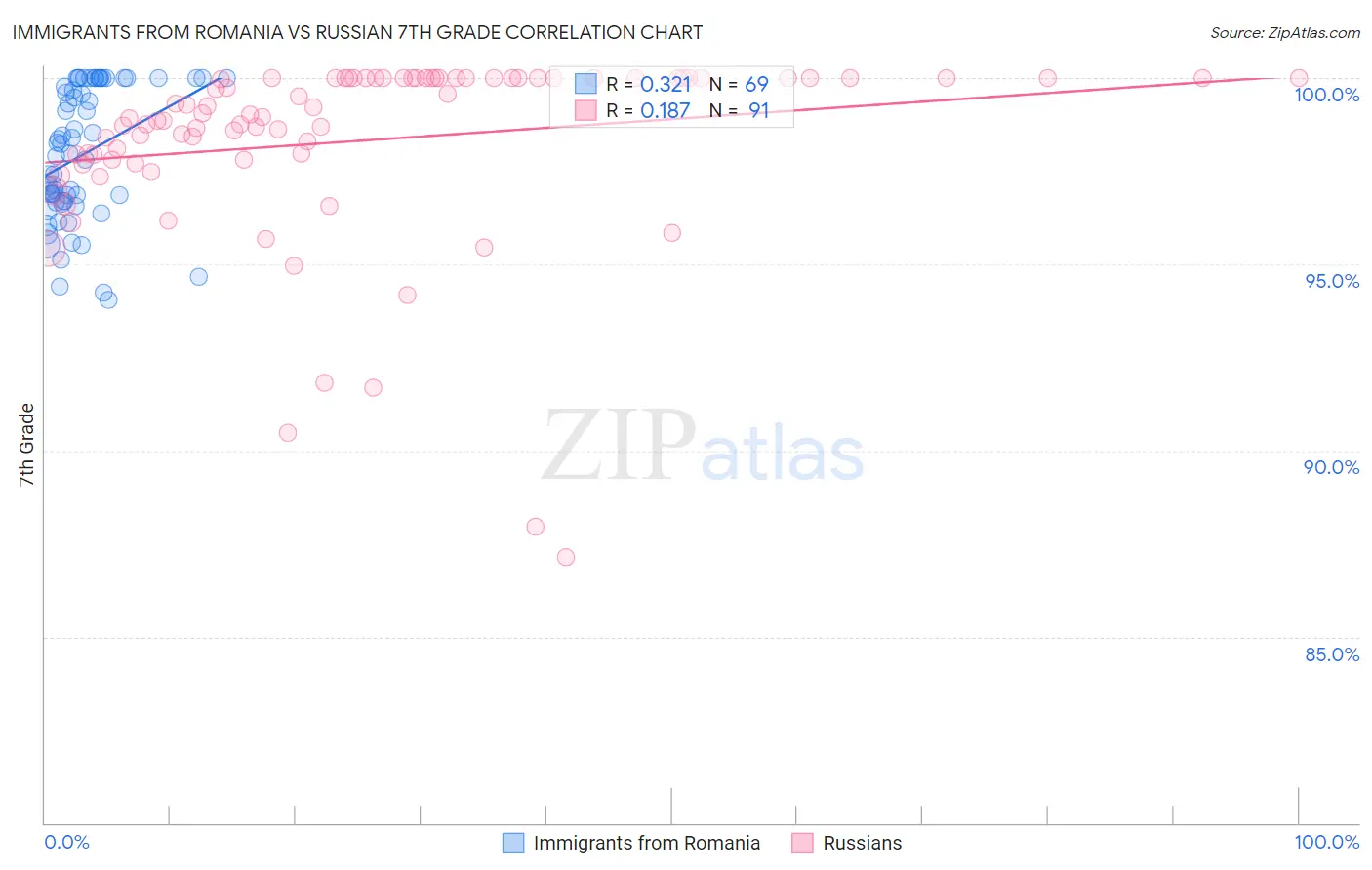 Immigrants from Romania vs Russian 7th Grade Correlation Chart