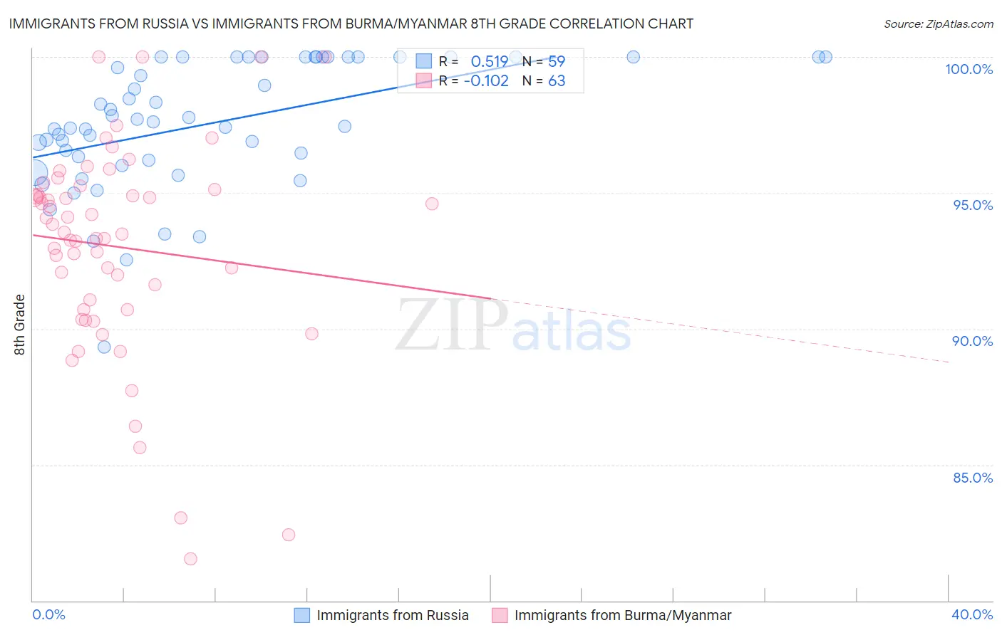 Immigrants from Russia vs Immigrants from Burma/Myanmar 8th Grade Correlation Chart