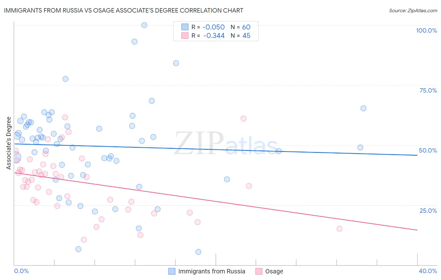 Immigrants from Russia vs Osage Associate's Degree Correlation Chart