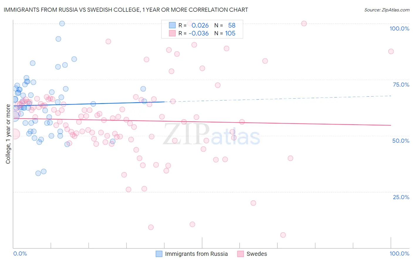 Immigrants from Russia vs Swedish College, 1 year or more Correlation Chart
