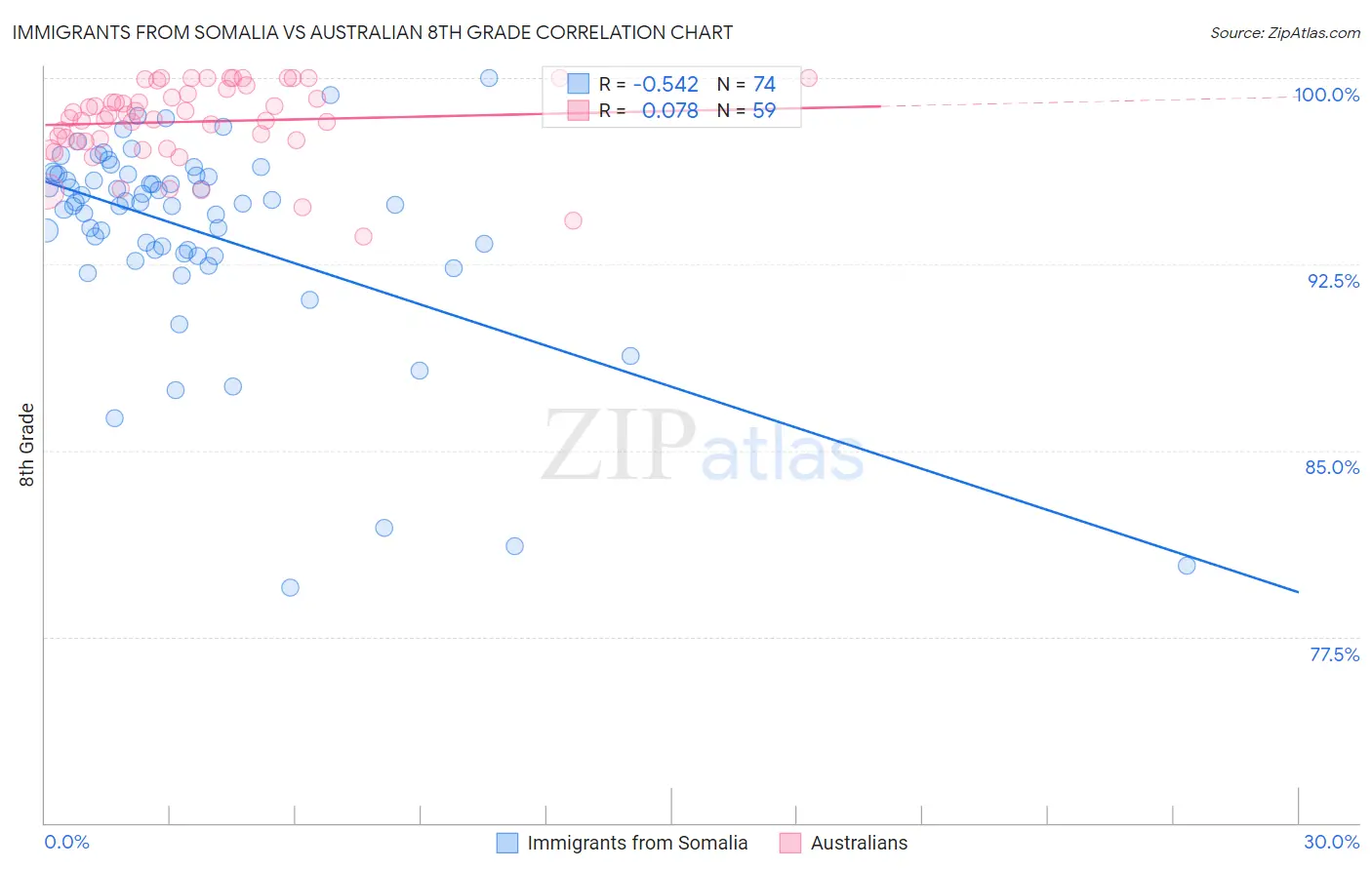 Immigrants from Somalia vs Australian 8th Grade Correlation Chart