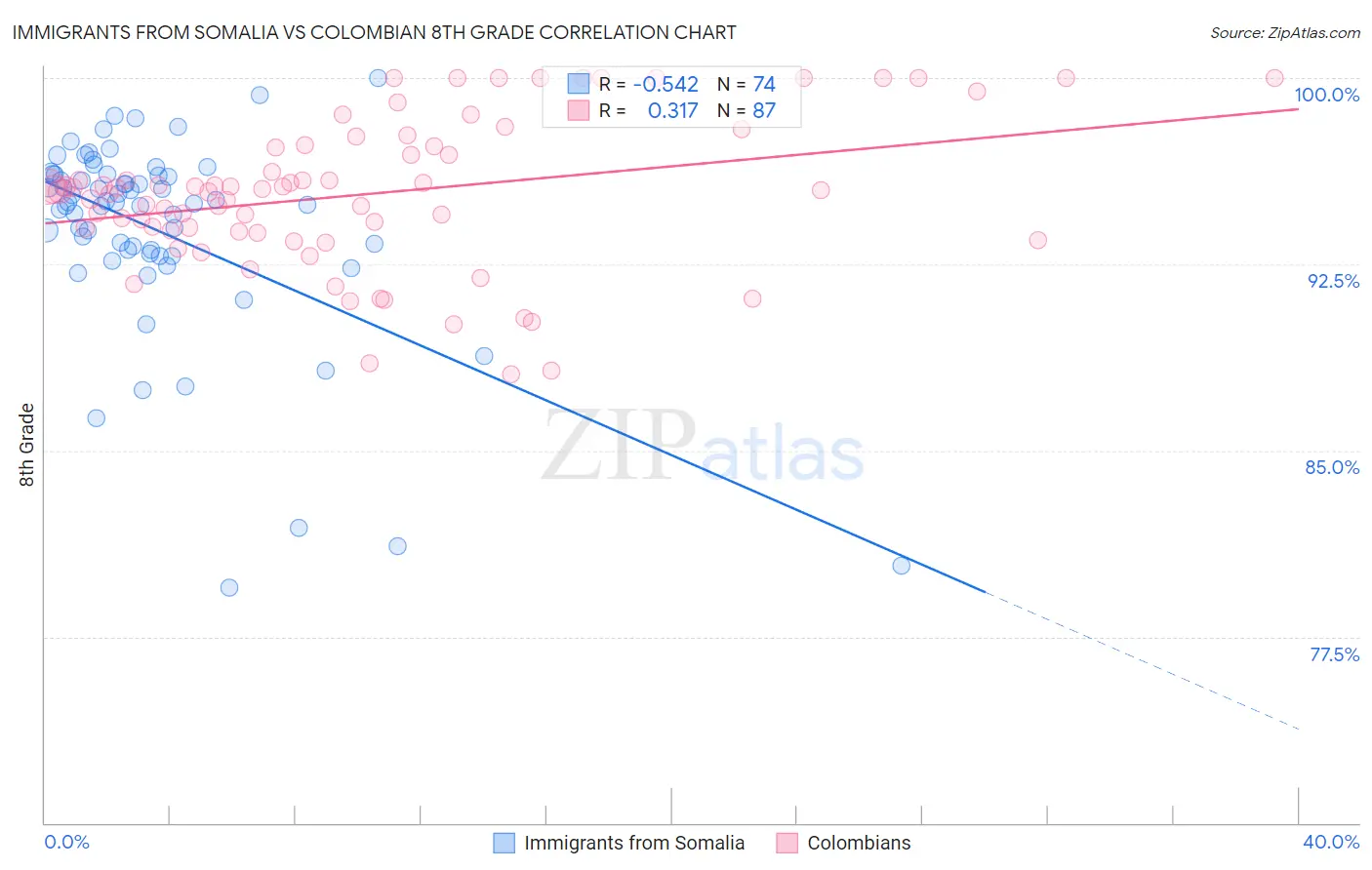 Immigrants from Somalia vs Colombian 8th Grade Correlation Chart