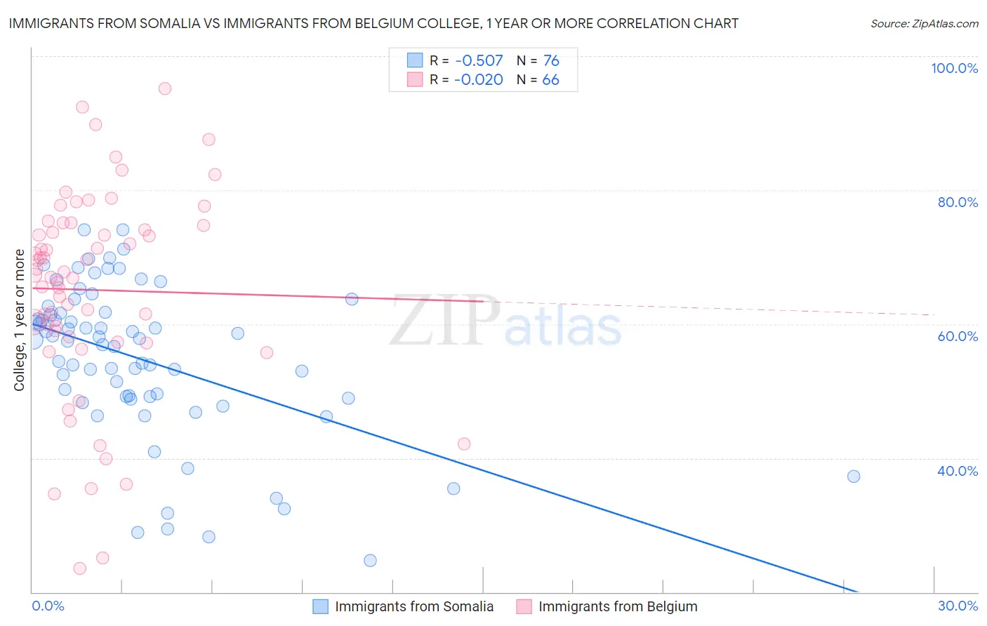 Immigrants from Somalia vs Immigrants from Belgium College, 1 year or more Correlation Chart