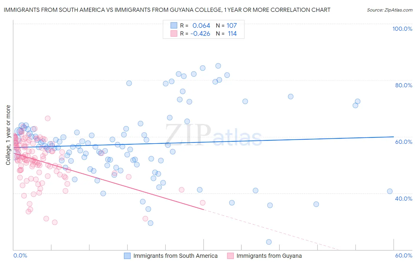 Immigrants from South America vs Immigrants from Guyana College, 1 year or more Correlation Chart
