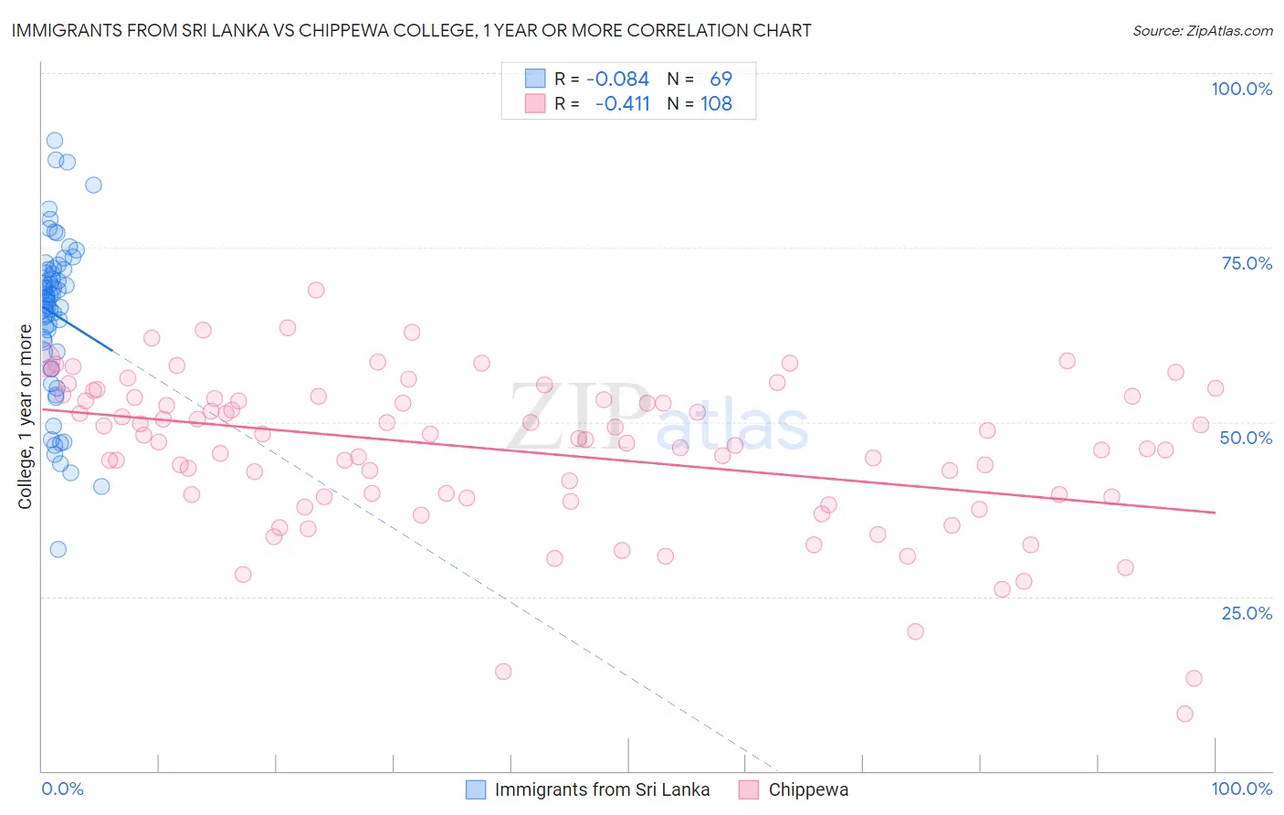 Immigrants from Sri Lanka vs Chippewa College, 1 year or more Correlation Chart