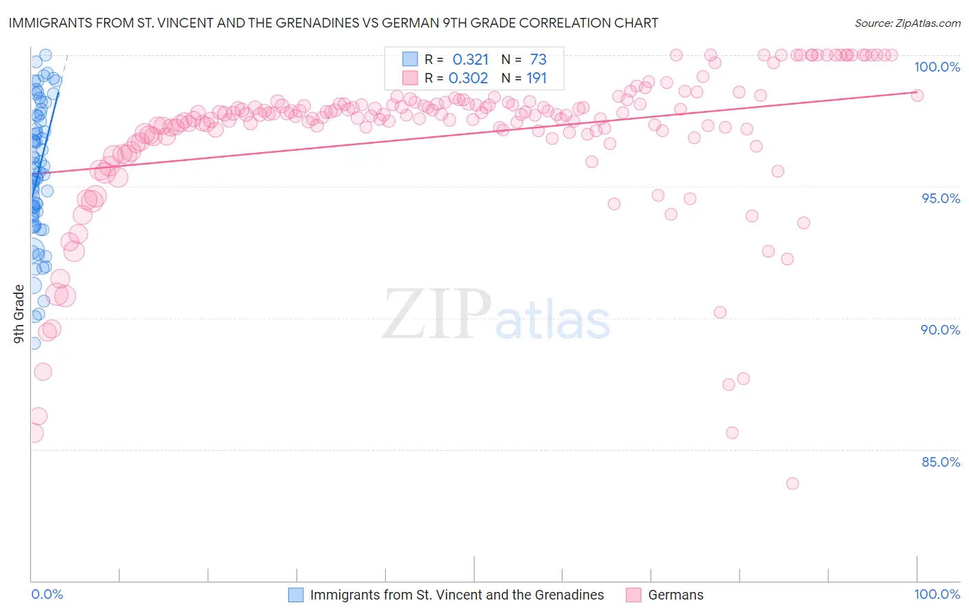 Immigrants from St. Vincent and the Grenadines vs German 9th Grade Correlation Chart