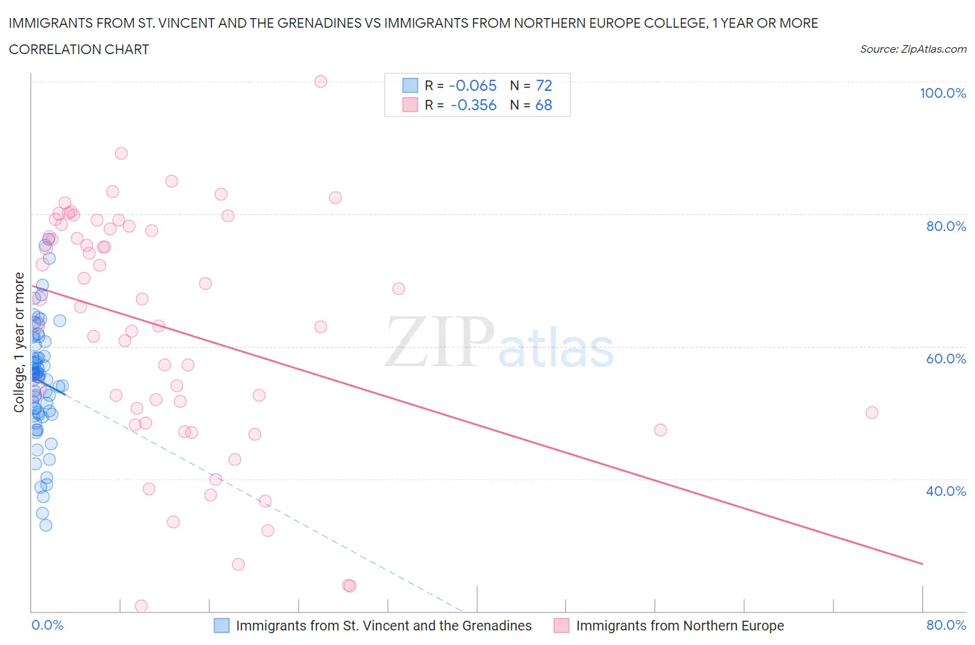 Immigrants from St. Vincent and the Grenadines vs Immigrants from Northern Europe College, 1 year or more Correlation Chart