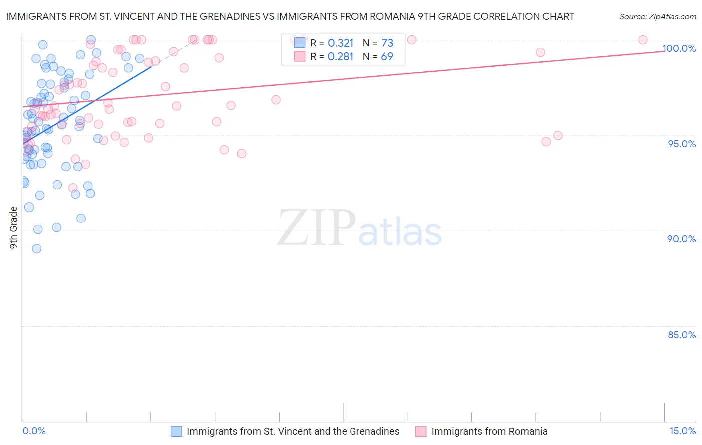 Immigrants from St. Vincent and the Grenadines vs Immigrants from Romania 9th Grade Correlation Chart