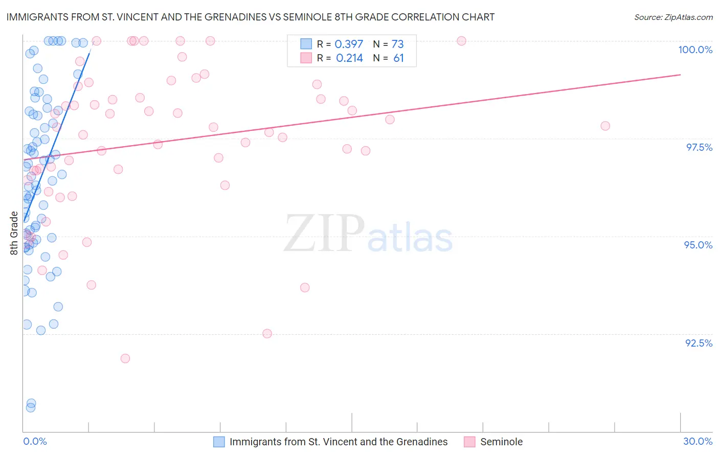 Immigrants from St. Vincent and the Grenadines vs Seminole 8th Grade Correlation Chart