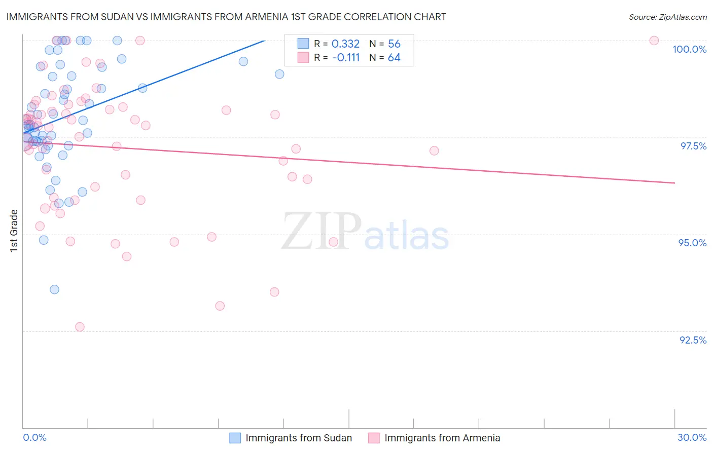 Immigrants from Sudan vs Immigrants from Armenia 1st Grade Correlation Chart