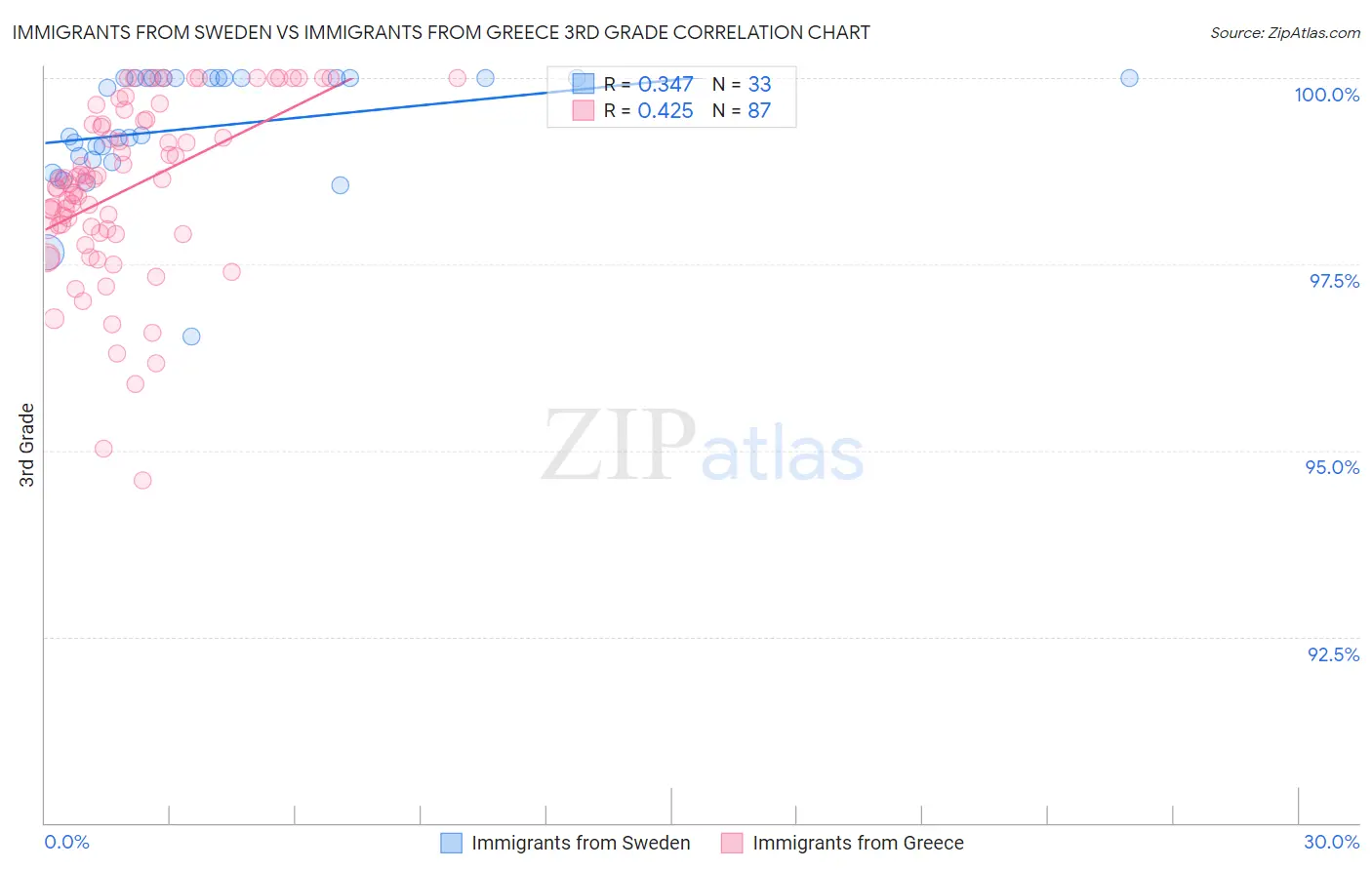 Immigrants from Sweden vs Immigrants from Greece 3rd Grade Correlation Chart