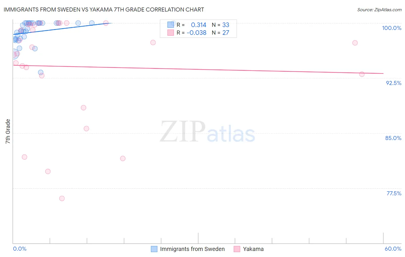 Immigrants from Sweden vs Yakama 7th Grade Correlation Chart