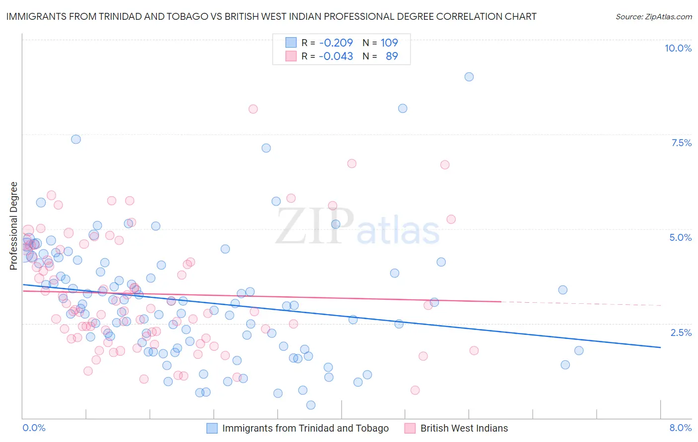 The statistical analysis conducted on geographies consisting of 223,309,655 people shows a weak negative correlation between the proportion of Immigrants from Trinidad and Tobago and percentage of population with at least professional degree education in the United States with a correlation coefficient (R) of -0.209 and weighted average of 3.9%. Similarly, the statistical analysis conducted on geographies consisting of 152,575,254 people shows no correlation between the proportion of British West Indians and percentage of population with at least professional degree education in the United States with a correlation coefficient (R) of -0.043 and weighted average of 3.8%, a difference of 1.9%.