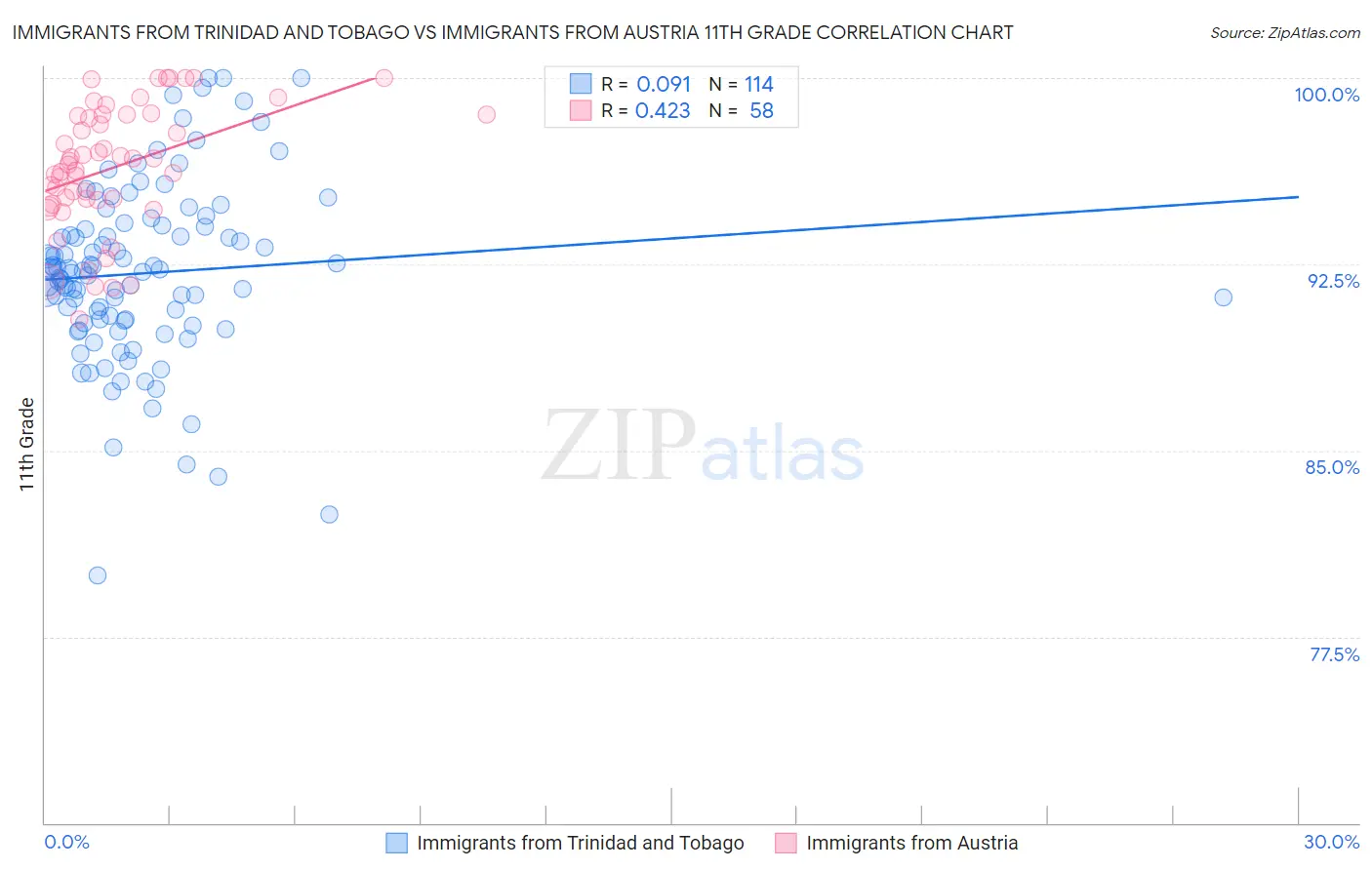 Immigrants from Trinidad and Tobago vs Immigrants from Austria 11th Grade Correlation Chart