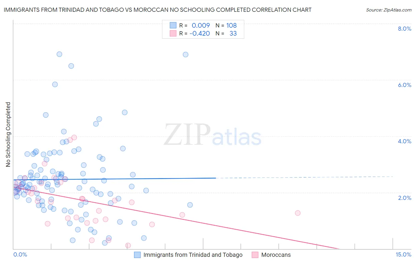 Immigrants from Trinidad and Tobago vs Moroccan No Schooling Completed Correlation Chart