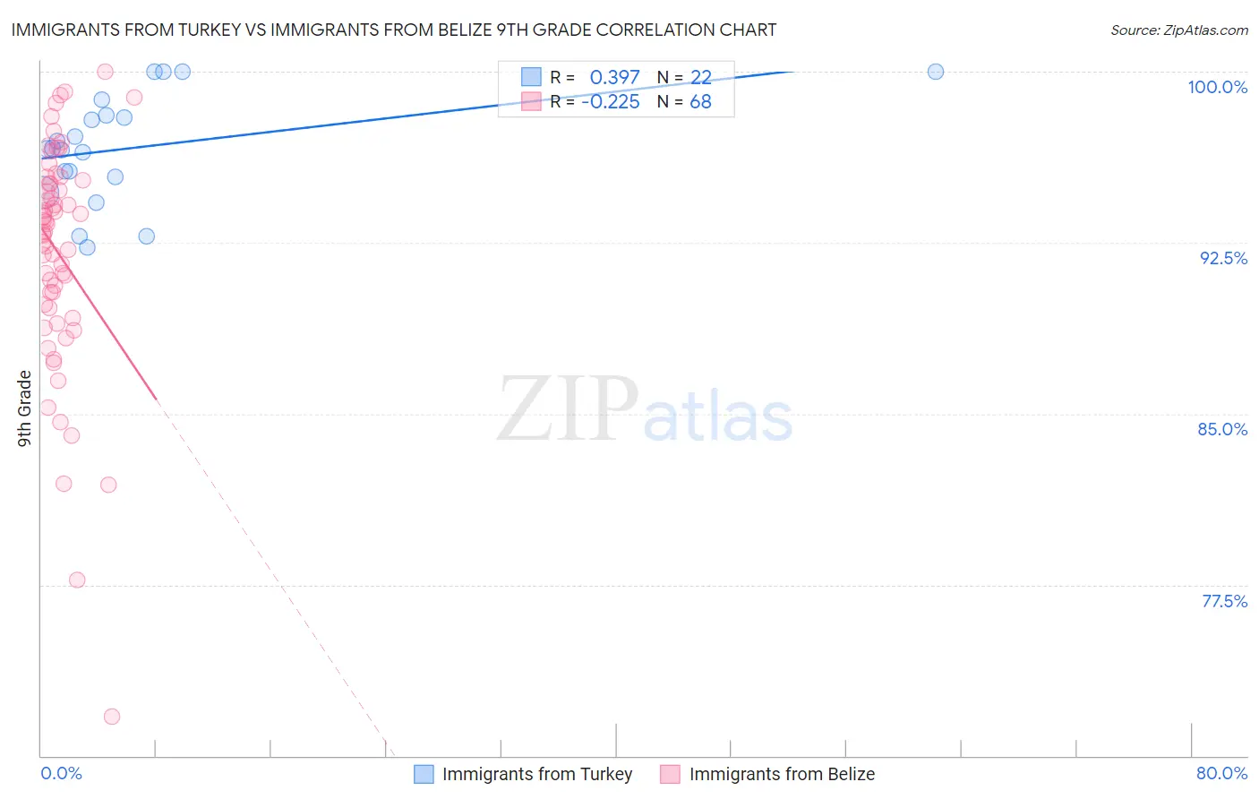 Immigrants from Turkey vs Immigrants from Belize 9th Grade Correlation Chart
