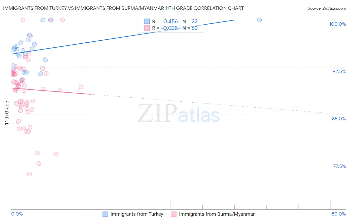 Immigrants from Turkey vs Immigrants from Burma/Myanmar 11th Grade Correlation Chart