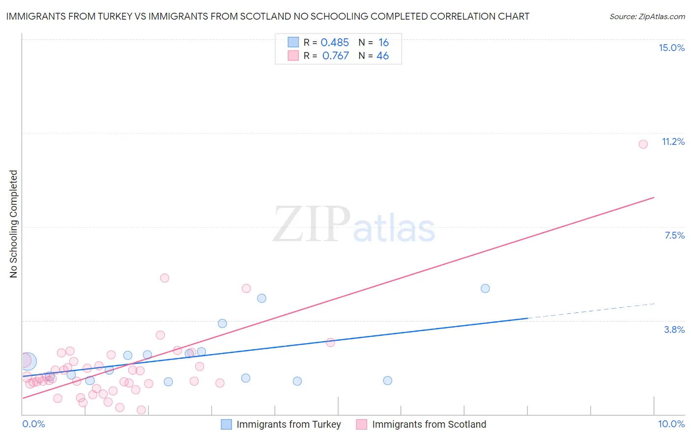 Immigrants from Turkey vs Immigrants from Scotland No Schooling Completed Correlation Chart